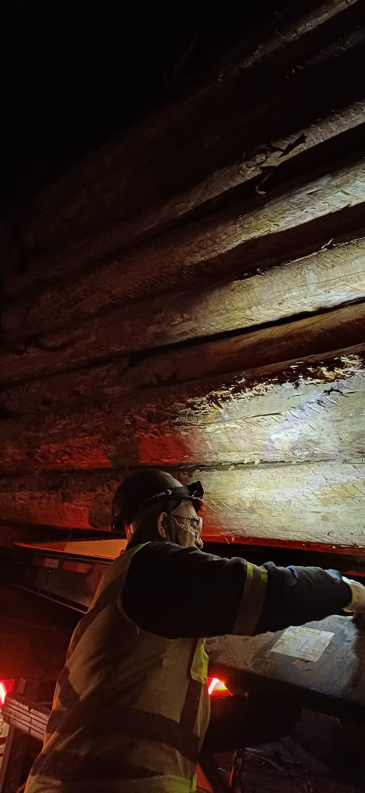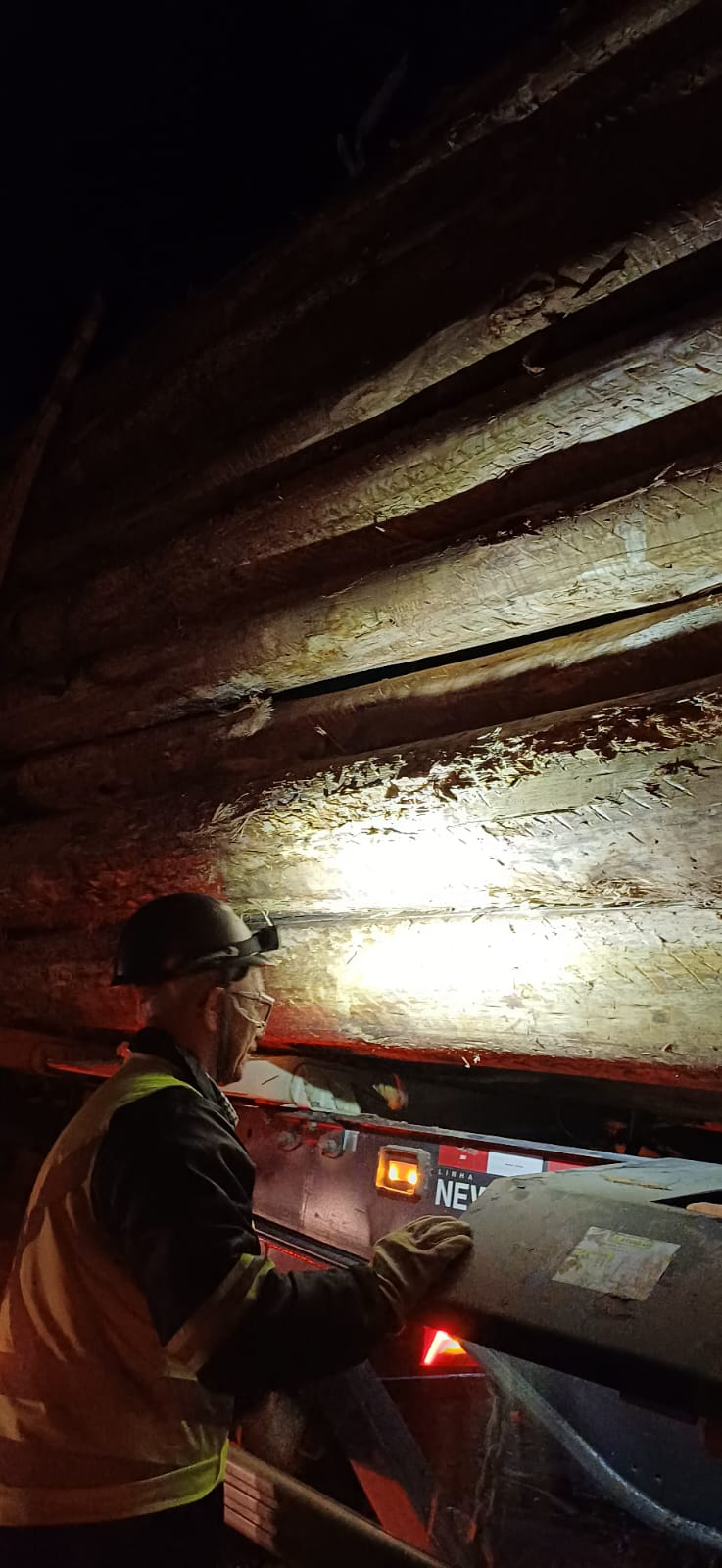 Segurança e visibilidade. Para isso, nossa equipe do transporte florestal da filial Pelotas - RS utiliza capacetes com lanterna, que servem para garantir a segurança e a visibilidade durante as atividades em ambientes com pouca luz natural.